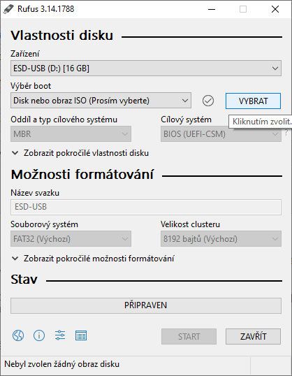 Po spuštění aplikace se nám zobrazí jednoduché okno, kde uvidíte vše potřebné. První kolonka označuje vložený USB disk, vše ostatní ponechte tak jak je a klikněte na tlačítko "Vybrat".